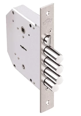 Замок врезной сувальдный Гранит 1.06.40 6-ти сувальдный для дверей усиленной конструкции левостороннего открывания. Соответствует 4 классу, кодовый механизм обеспечивает 1,5 млн. комбинаций. 4-х ходовый засов, диаметр ригелей 18 мм. Вылет ригелей 40 мм обеспечивает защиту от отжима двери. Блокирующие зубцы и П-образный фиксатор защищает от вскрытия замка отмычками.Замок без тяг. Цвет никель.
